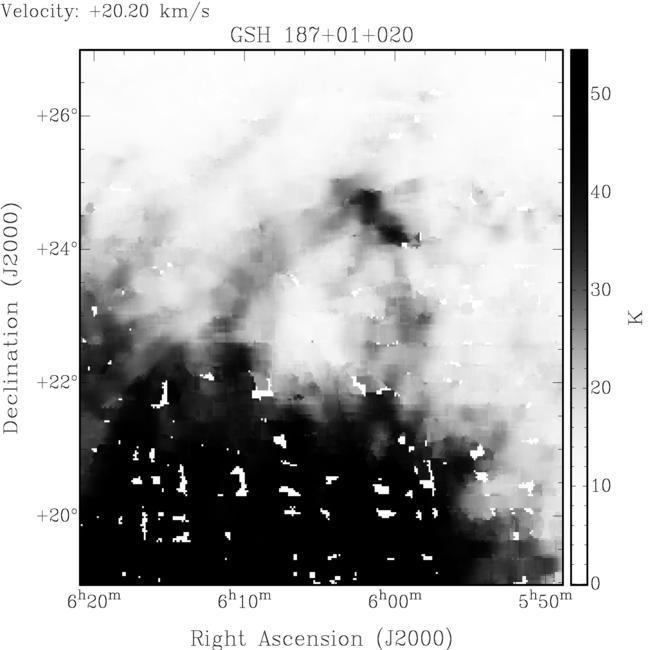 Seems associated with spiral structure but kinematic distances are too large for spiral structure in this direction (actually at 2.5 kpc not 10 kpc). May be affected dramatically by streaming motions. Kinematic distances could well be inaccurate.